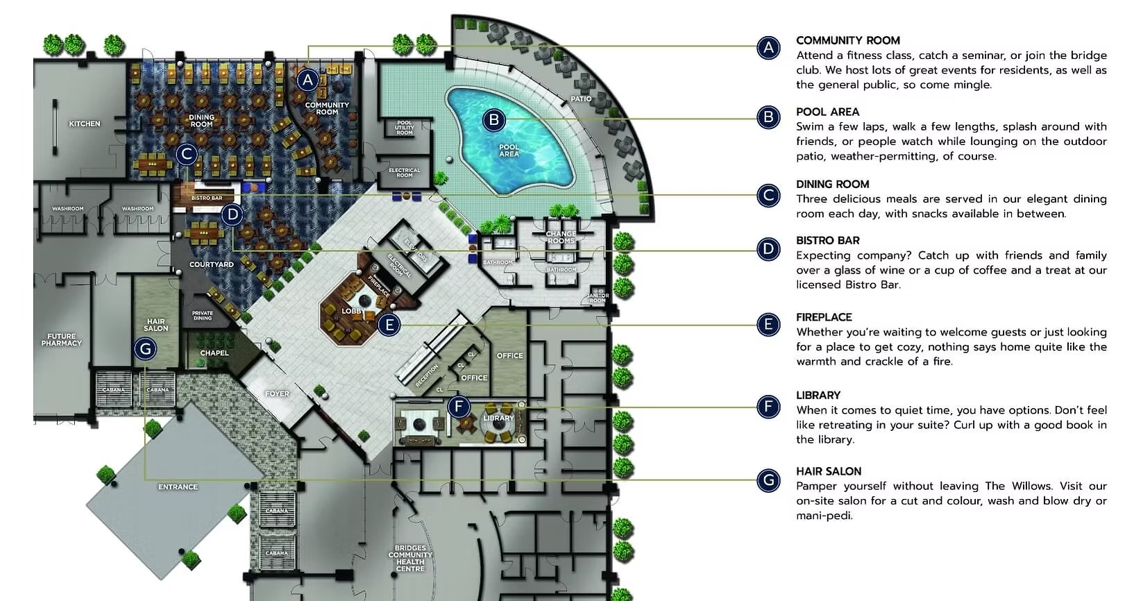 The Willows celebrates active living with an exceptional collection of on-site amenities designed for your enrichment and convenience. Discover endless possibilities without stepping outside your home, from rejuvenating wellness services to exciting social experiences.